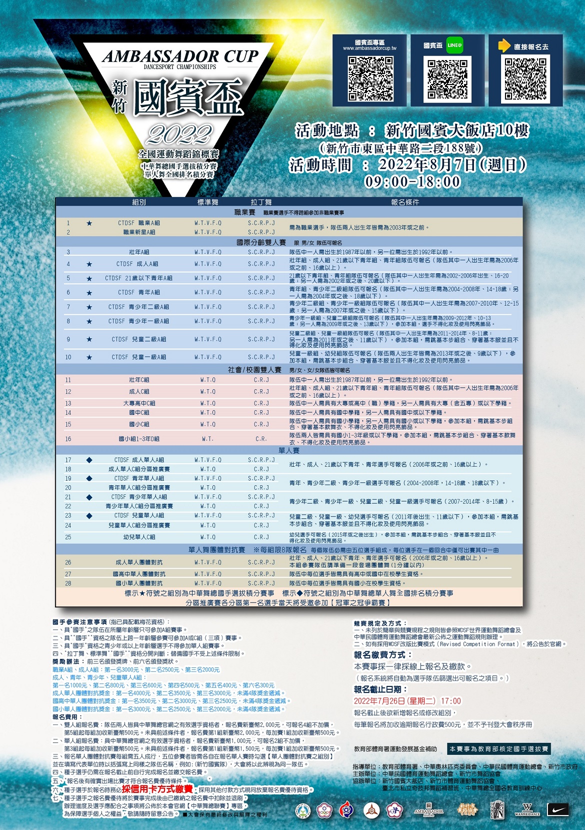 ♦ 每個教室可申請教練證及領隊出入證各一張,申請教練出入證者需具有中華舞總有效教練資格,並需於7/26前至Line官方帳號提出申請。
