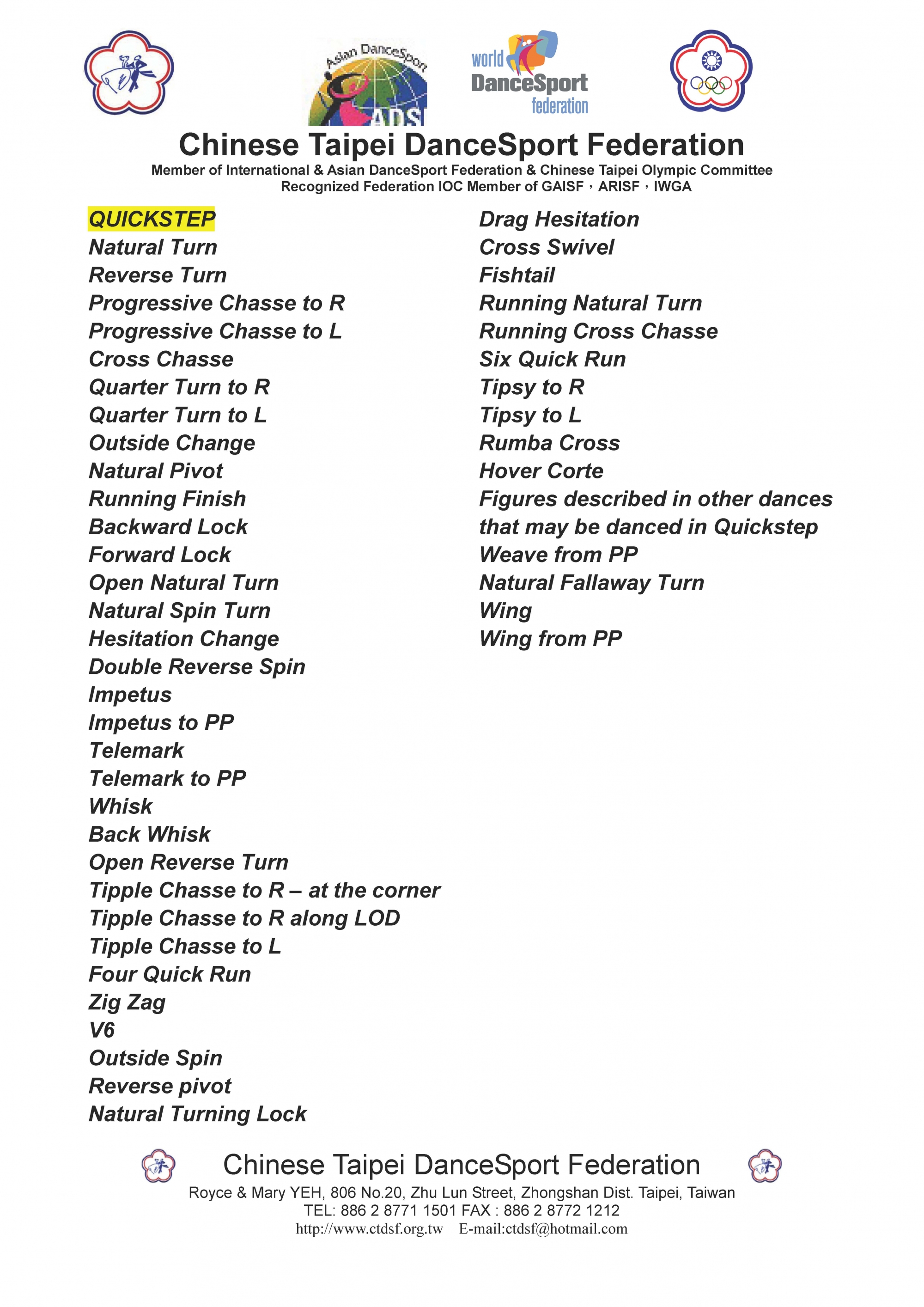 成績 Ruslt賽程表 Program選手總表 Overview兒童組及以下組別舞步規定 Competition figures for all Juvenile 大會特聘世界知名運動舞蹈造型師 Style and fabulous for the Athlete贊助購票辦法 Ticket Booking服裝規定costume rules旅費補助 Travelling allowance交通 Airport Transport選手報到 Couples Check-in飯店住宿 Official Hotel踩場時間 Practice Time比賽場館competition venue賽會指定聯絡窗口 Organizer Contact獎狀及獎盃 Award certificate and trophy簽證 Visa大滿貫裁判 GrandSlam Adjudicators 兒童組及以下組別舞步規定Competition figures for all Juvenile and under